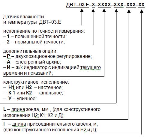 Условное обозначение датчика относительной влажности и температуры ДВТ-03.E: